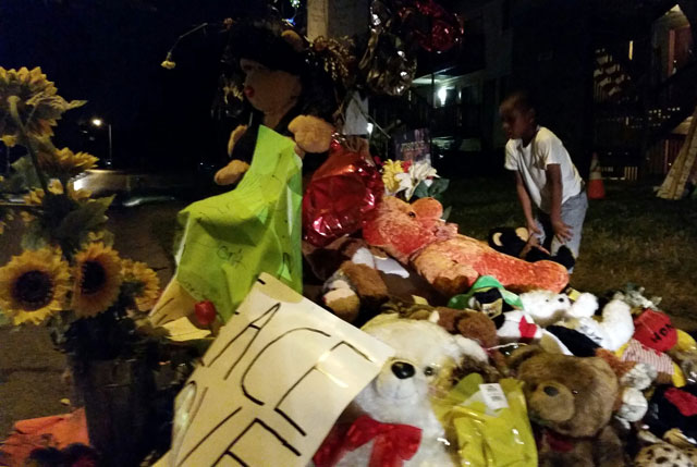 On one side of the street are the protesters, mostly African American, carrying signs, shooting photos, being interviewed by mostly white journalists. On the other side are the police, virtually all white, from a variety of police departments. A pack of five-o zip by in an SUV with an officer sitting on edge of the opened trunk, his feet dangling inches above the asphalt. People watch and wonder aloud what would happen if they tried to do that.